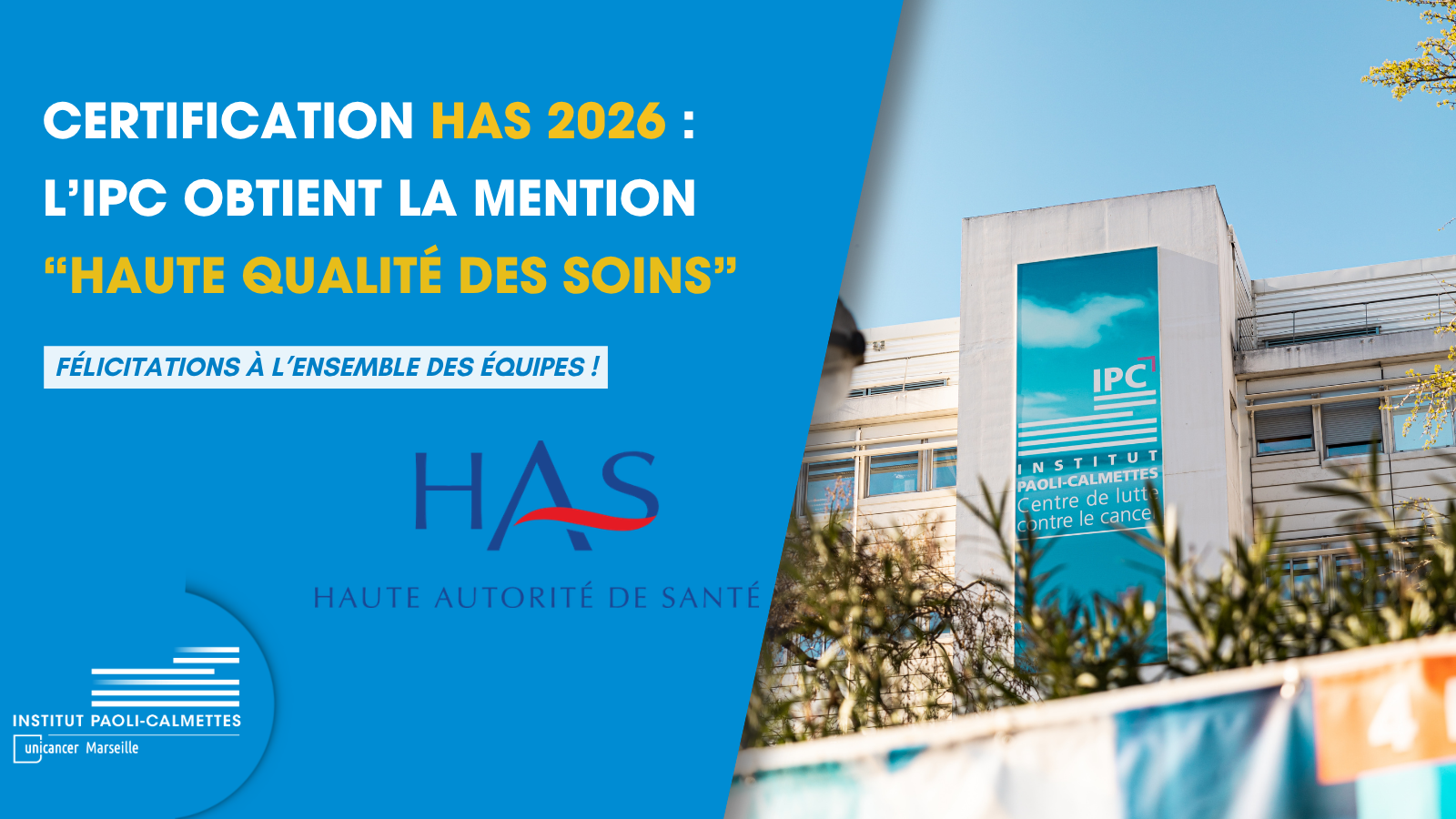 L’Institut Paoli-Calmettes a obtenu, en février 2026, la certification de la Haute Autorité de Santé (HAS) avec la mention “Haute Qualité des soins”, la plus haute distinction du dispositif national de certification des établissements de santé.