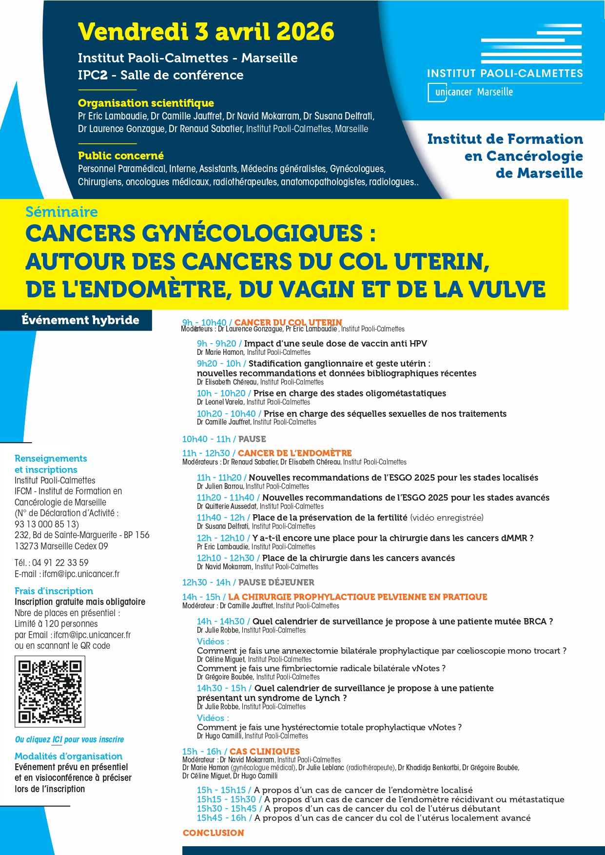 L’Institut Paoli-Calmettes vous donne rendez-vous le vendredi 3 avril pour un séminaire consacré aux cancers gynécologiques, organisé par l’Institut de Formation en Cancérologie de Marseille.